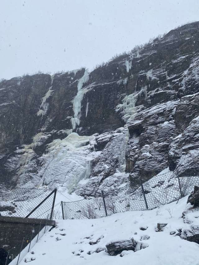 The Flamsbana scenic route makes one short stop along the route for photos at the base of Kjossen Waterfall. Even though it was frozen, it still made for an awesome spectacle.