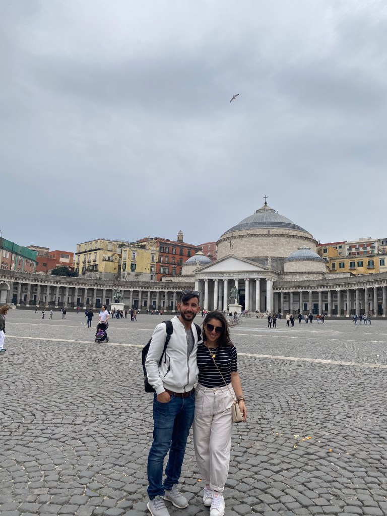 We finally reached the Piazza del Plebiscito, where the free walking tour was going to take place. We sat down in a café, sipping our cappuccino whilst waiting for the tour to start. Khaled and I were truly invested in a rather loud conversation happening in the table next to us with 2 American businessmen explaining how angry they were that they flew all the way to Naples for their Italian counterpart to be really late to the meeting and then not compromise on a deal. We shouldn’t have eavesdropped, but I mean… they were right next to us and the story was quite riveting. a