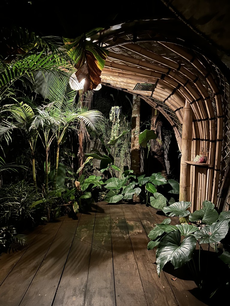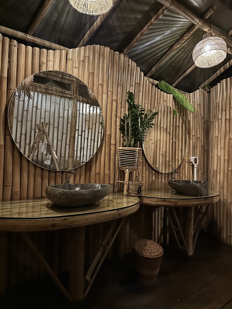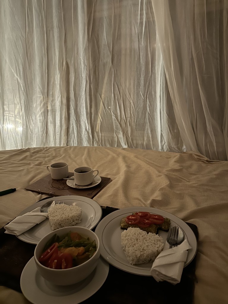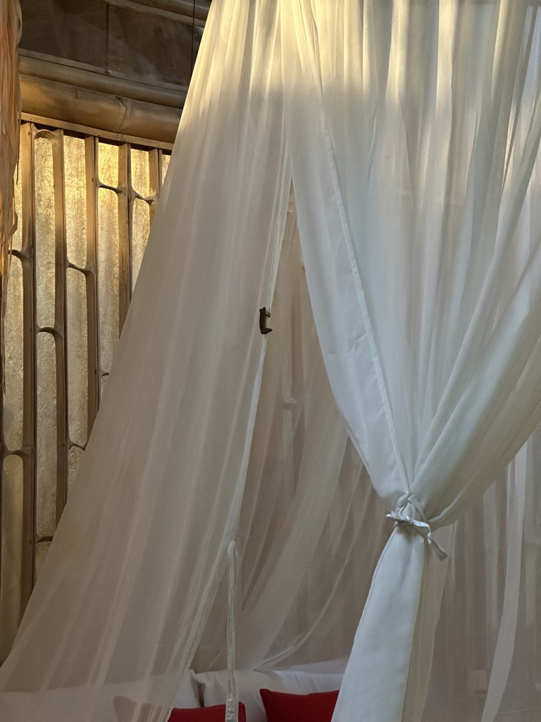We were dipping our toes in the pool and waiting for the sun to set. We both commented on how there were sounds of gekkos, lizards, frogs that sounded like it was coming from inside of the bamboo house. We turned around and saw 5-6 different creatures on the table, bamboo structure, floor etc. This is when I realised Khaled really doesn’t like frogs (haha oops!). At first, we attempted to shoo them but it was just a bit of a fail as more kept coming in. Honestly, if anyone was watching this, they would have a run for their money as we looked a sight! We quickly picked up our suitcases, made a cup of coffee (priorities) and went upstairs to our room. We quickly got into our bed and closed the mosquito net around us. We couldn’t stop laughing at how these small little creatures imprisoned us in a place that we are paying for!