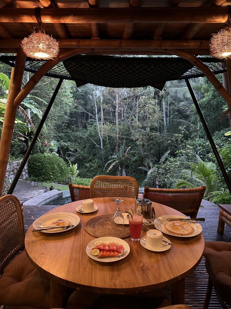 We decided to stay in a bamboo villa, after a luxurious 2 night-stay at Wapa di Ume in Sideman. The link to the one we stayed in is here. Upon arrival, we were greeted by two very friendly workers of the hotel who showed us around and explained how to use some of the amenities. As this wasn’t a traditional hotel but instead an air bnb stay, there were no staff there but they did provide us with a WhatsApp number in case we needed anything or any food (there was a menu we could order from).